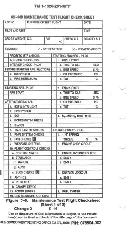 This AH-64D checklist contains checks associated with Maintenance Test flights.